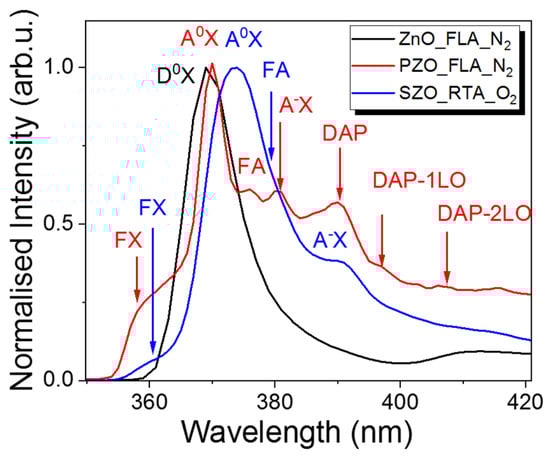 The peak at about 380.7 nm (3.246 eV) is due to the optical transition of the ionized acceptor–exciton transition (A-X). Moreover, the P-doped sample shows donor-to-acceptor pair optical transitions (DAP) and their longitudinal optical phonon replicas (DAP-1LO and DAP-2LO) []. The low-temperature PL emission from an Sb-doped sample and annealed in oxygen by the RTA process shows the main peak due to a neutral acceptor–bound exciton transition at about 373.5 nm (3.292 eV) and the A-X transition appears at 390.8 nm (3.163 eV). The free exciton transition in SZO is observed at 360.9 nm (3.425 eV). The red shift of the PL emission after Sb doping is expected since the Sb in ZnO is assumed to be a deep acceptor with an ionization energy of about 160 meV [].