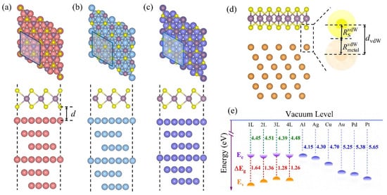 The top and side views for (a) 1L MoS2-Al/Pt, (b) 1L MoS2-Ag/Cu/Au, and (c) 1L MoS2-Pd. (d) Schematic illustration of the interlayer distance (dvdW); and are the vdW radii of S atoms and metal atoms, respectively. (e) The band alignments of MoS2 and metals. Ec, Ev, and ΔEg represent the conduction band edge, valence band edge. and band gap of MoS2, respectively.