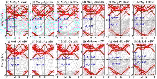 The projected band structures of (a–f) 1L MoS2-metal close interfaces and (g–l) 1L MoS2-metal vdW interfaces. The gray curves represent the band structures of MoS2-metal interfaces. The red-dotted curves denote the band structures of MoS2.
