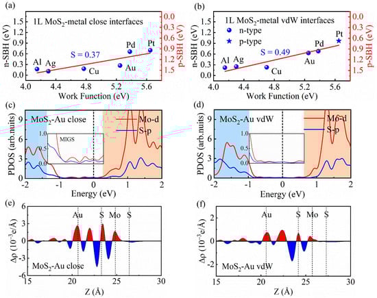The SBHs versus the metal work functions for (a) 1L MoS2-metal close and (b) 1L MoS2-metal vdW interfaces. The partial density of states (PDOS) of (c) 1L MoS2-Au close and (d) 1L MoS2-Au vdW interfaces. The magnified PDOS represents the MIGS. The valence band is shaded in blue and the conduction band is shaded in orange. (e) The plane average charge-density difference Δρ (z) of 1L MoS2-Au close and (f) 1L MoS2-Au vdW interface. The red and blue colors represent charge accumulation and depletion, respectively.