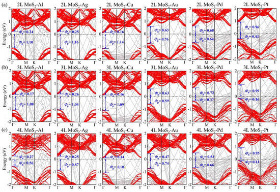 The projected band structures of (a) 2L MoS2-metal vdW interfaces, (b) 3L MoS2-metal vdW interfaces, and (c) 4L MoS2-metal vdW interfaces. The gray curves represent the band structures of MoS2-metal interfaces. The red-dotted curves denote the band structures of MoS2.