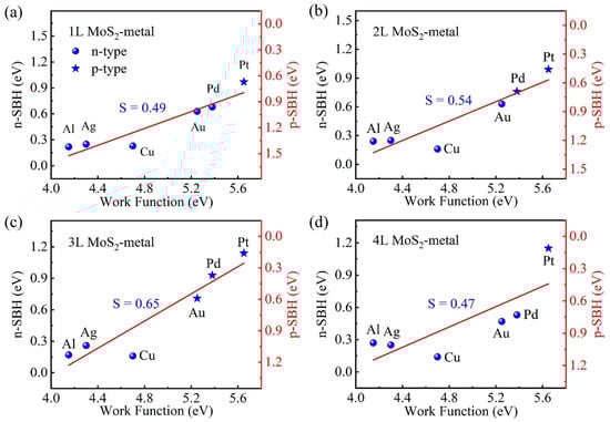 The SBHs versus the metal work functions for (a) 1L MoS2-metal vdW interfaces, (b) 2L MoS2-metal vdW interfaces, (c) 4L MoS2-metal vdW interfaces, and (d) 4L MoS2-metal vdW interfaces. The pinning factors S are marked in the pictures.