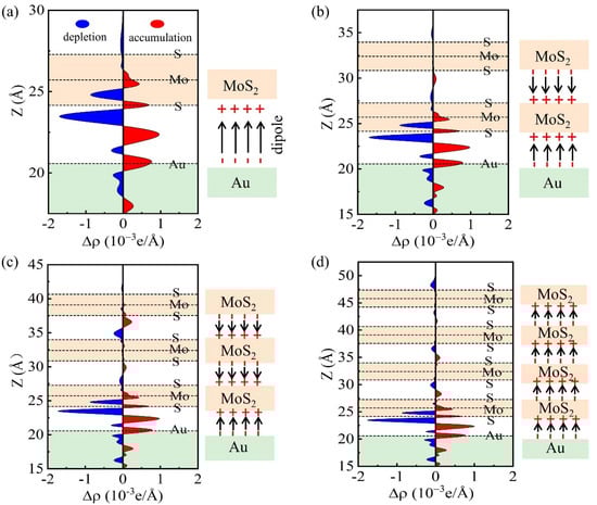 The plane-average charge-density difference (in the left planes) and the schematic illustration of charge transfer (in the right planes) of (a) 1L MoS2-Au vdW interface, (b) 2L MoS2-Au vdW interface, (c) 3L MoS2-Au vdW interface, and (d) 4L MoS2-Au vdW interface. The arrows represent the direction of interface dipoles.