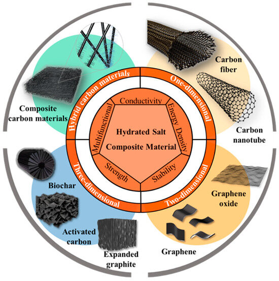 Among the various fillers investigated so far, carbon materials have emerged as one of the favorites for comprehensively improving the thermophysical properties of hydrated salts because they possess various desired features, such as high thermal conductivity, strong solar absorptance, large specific surface area, light weight, and an abundance of low-cost raw materials [16,23,28,29,30]. In recent years, attempts have been made to compound hydrated salts with different carbon fillers, including one-dimensional (1D) carbon nanotubes (CNTs) and carbon fibers (CFs); two-dimensional (2D) graphene oxide (GO), reduced graphene oxide (rGO) and graphene; and three-dimensional (3D) expanded graphite (EG), biochar and activated carbon (Figure 1). Compared with pristine hydrated salts, the carbon-enhanced hydrated salt composites have demonstrated improved thermophysical properties, including high thermal conductivity, suppressed supercooling and strong resistance to phase separation and liquid leakage. The carbon-enhanced hydrated salt PCM composites combine the advantageous features from both the low-cost inorganic PCM components and the abundant carbon fillers to fulfill the potential for diverse thermal-related applications. Through introducing other functional fillers, the carbon-enhanced hydrated salt composites have exhibited extra functionalities, such as the direct conversion and storage of electro-thermal and magneto-thermal energy and dynamic tuning of the thermal energy charging and discharging processes. Meanwhile, the thermal conductivity, specific surface area, and surface chemistry vary for different carbon fillers, which in turn affect their compounding with hydrated salts and the enhancement of thermophysical properties. The selection of appropriate types of carbon fillers, loading levels and compounding processes is critical to achieving the optimal performance of carbon-enhanced hydrated salt PCM composites.