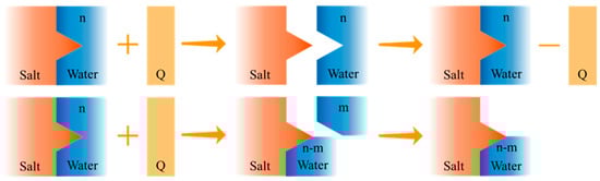 One example is that dihydrates form during the melting of Mg(NO3)2·6H2O and the undissolved dihydrates or anhydrous salts cause phase separation. The precipitated salts cannot recombine with water in the subsequent freezing process, which prevents the release of latent heat (Figure 2). During the melting process, the crystallization water can be transformed into vapor, especially when the hydrated salts are rapidly and intensively heated up above their melting points. For example, when sodium acetate trihydrate (CH3COONa·3H2O, SAT), which has a melting point of 58 °C, is heated to 90 °C, it firstly undergoes a solid–liquid phase change and then experiences a more pronounced heat absorption involving the further decomposition of the crystallization water [60,61]. This will cause an obvious loss of water and lead to phase separation, incongruent melting, and deteriorated storage performances. In addition to chemically bound crystallization water, hydrated salts can adsorb water from the ambient environment, which adds more complexity to the phase transition process.