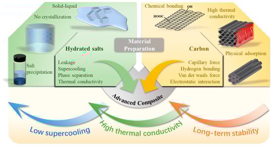 By modifying carbon materials with other functional additives, hybrid carbon materials can further enhance the original thermophysical properties of hydrated salts, provide extra means to tune the charging/discharging and phase change behaviors, and expand the application scope of PCMs [28,72,84,100]. For example, hybridizing carbon fillers with magnetic-response fillers or electrical conductors can allow for charging and storage of magnetic-thermal and electro-thermal energy within PCMs and enable the dynamic tailoring of the charging process through applying external magnetic or electrical fields.