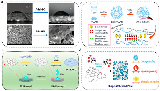(a) Addition of GO enables a reduction in the contact angle between melted DHPD and the porous expanded vermiculite skeleton from 56° to 45° (Figure 7a reprinted/adapted with permission from Ref. [67]. 2020, the American Chemical Society). (b) Improving thermophysical properties of eutectic hydrated salts by a GO-modified poly(acrylamide-co-acrylic acid) copolymer (PAAAM) hydrogel (Figure 7b reprinted/adapted with permission from Ref. [69]. 2016, Royal Society of Chemistry). (c) Impregnation of SAT within super-hydrophilic rGO aerogels modified by konjac glucomannan (Figure 7c reprinted/adapted with permission from Ref. [87]. 2022, the American Chemical Society). (d) Shape-stabilized solar-thermal storage SAT composites enhanced by hydrophilic GNPs and sodium phosphate monobasic monohydrate nucleating agents (Figure 7d reprinted/adapted with permission from Ref. [88]. 2021, Elsevier).