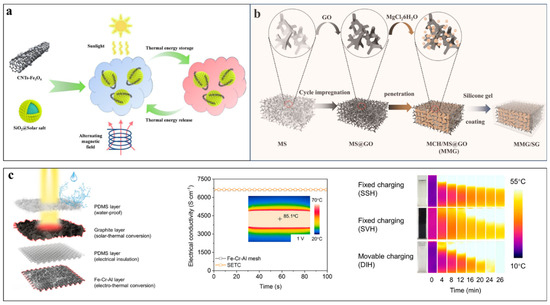 (a) Compounding SiO2 solar salts with Fe3O4-modified CNTs for simultaneous harvesting of solar-thermal and magnetic-thermal energy (Figure 10a reprinted/adapted with permission from Ref. [64]. 2023, Elsevier). (b) Magnesium chloride hexahydrate (MgCl2·6H2O, MCH) impregnated within a GO-decorated sponge for latent heat and thermochemical storage (Figure 10b reprinted/adapted with permission from Ref. [101]. 2023, Springer nature). (c) Dual-functional Fe–Cr–Al mesh coated with nano-graphite for movable charging of solar-thermal energy and electro-thermal energy (Figure 10c reprinted/adapted with permission from Ref. [102]. 2023, Elsevier).
