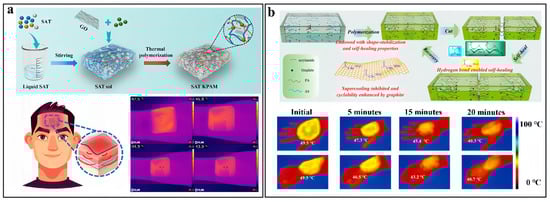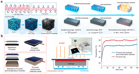 (a) SAT/EG composites for the two-stage thermal management of LIBs (Figure 11a reprinted/adapted with permission from Ref. [109]. 2022, Elsevier). (b) Passive cooling of commercial PV panels by attaching a polyacrylamide hydrogel loaded with CNTs and CaCl2 to the back side (Figure 11b reprinted/adapted with permission from Ref. [111]. 2020, Springer nature).