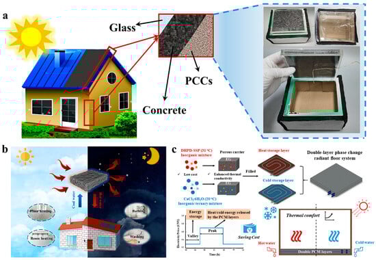 (a) SSD–biochar hydrated salt composites incorporated within a roof for stabilizing building temperature (Figure 12a reprinted/adapted with permission from Ref. [96]. 2024, Elsevier). (b) Hydrated salt composites for household heating (Figure 12b reprinted/adapted with permission from Ref. [112]. 2023, Elsevier). (c) A radiant floor system consisting of a heat storage layer made of Na2HPO4·12H2O–Na2SiO3·5H2O/EG composite and a cold storage layer made of CaCl2·6H2O–NH4Cl-SrCl2·6H2O/EG composite for improving indoor thermal comfort (Figure 12c reprinted/adapted with permission from Ref. [113]. 2020, Elsevier).