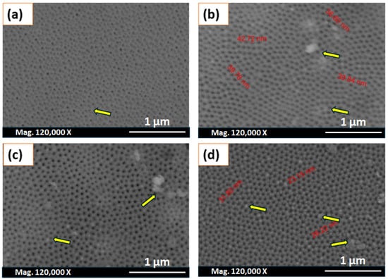 Top-view SEM images of the Al2O3 membrane surface after the second anodisation for (a) 3 h, (b) 5 h, (c) 7 h, and (d) 10 h in 0.3 oxalic acid at 40 V and 0 °C (yellow arrows represents dislocations and grooves found in the samples).