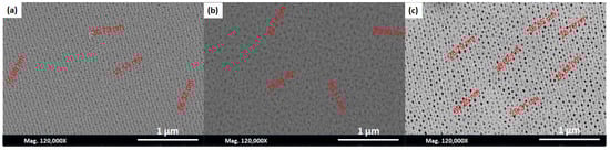 Figure 8 illustrates the impact of annealing an AAO membrane on the porous structure of AAO membranes prepared using oxalic acid. Samples annealed at 500 °C showed the smallest pore size, which is approximately 37.8 nm, with no change in the pore features compared to the untreated membranes (Figure 8a). By increasing the annealing temperature from 600 °C to 700 °C, the pores appear to have been widened, as they increased from 51.6 nm to 55.6 nm (Figure 8b,c). Conversely, the thickness of the walls and barrier layers decreased with the increasing temperature, as shown in Table 4. Furthermore, the shape of the pores is hexagonal and more uniform in the samples annealed at 600 and 700 °C.