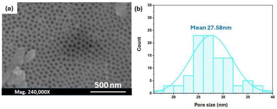 The inspection of the effect of the time of the first anodisation process on the pore characteristics of the membrane prepared in sulphuric acid was tested at a constant voltage, i.e., 25 V. Figure 7 shows the effect of a long anodisation time in both steps (first anodisation = 8 h; second anodisation = 18 h) on the properties of the obtained pores. According to the pore distribution curve, the average pore diameter is 27.58 nm and the interpore distance is 74.9 nm. This experimental observation further supports our hypothesis that the second anodisation process slightly controls the pore properties of the AAO membrane up to a certain value, above which the pore features start to change.