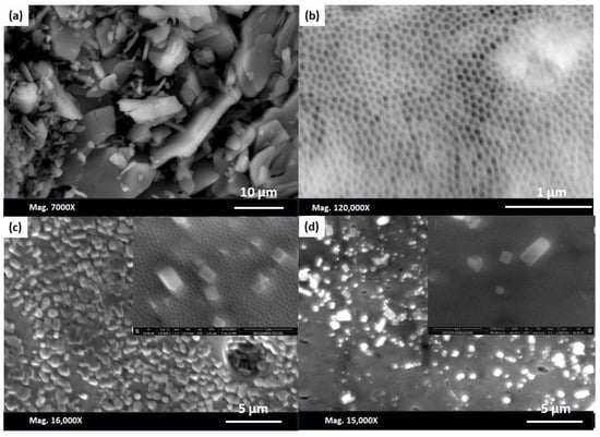 SEM images of (a) the drug particles, (b) the drug dissolved in water and loaded in the 10 h oxalic-acid-prepared AAO membrane, (c,d) and the drug dissolved in the ACSF and loaded in the 10 h oxalic- and sulphuric-acid-prepared membranes, respectively.