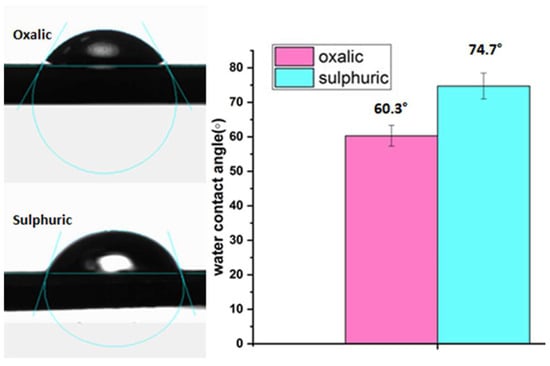 The surface hydrophilicity of the AAO membranes prepared using oxalic acid and sulphuric acid was determined using contact angle measurements. The contact angle is determined by measuring the angle between the surface of the membranes and water droplets. The contact angle instrument tracks the droplet behaviour on the surface until it stops changing. As shown in Figure 11, the results indicate both the oxalic- and sulphuric-acid-prepared membranes exhibit hydrophilic properties. Also, the results have shown that the contact angle of the oxalic-acid-prepared membranes is 60.3°, which is smaller than the contact angle of the sulphuric-acid-prepared membranes, which is 74.7°. The contact angles with the water were highly influenced by the chemical composition of the membranes. This indicates that the oxalic-acid-prepared membranes are more hydrophilic than the sulphuric-acid-prepared ones. The difference in the functional groups present on the membranes’ surface may account for this difference. The presence of COOH functional moieties on the oxalic-acid-prepared membranes makes them more hydrophilic than the S-O-containing membranes [49,50].