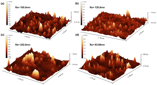 The three-dimensional AFM images for the AAOs of different membranes fabricated in different electrolytes at 5 h/10 h are shown in Figure 12. The AFM analysis demonstrates an increase in the surface roughness of the AAO after drug loading in the case of oxalic acid (Figure 12a,b), resulting in a higher surface area. On the other hand, after drug loading, the surface roughness of the membranes fabricated in H2SO4 decreased from 222 nm to 63 nm. A more refined topography was observed for the surface of the membrane prepared by oxalic acid as compared to sulphuric acid.