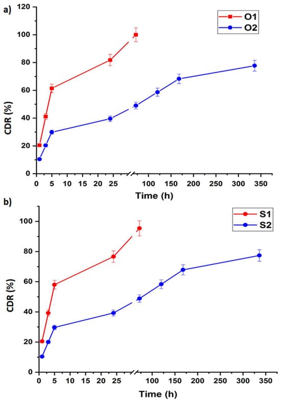 All of the samples (Figure 13a,b) showed a burst release of donepezil within the first 5 h. This is because the drug is near the surface and is being absorbed or trapped there, making it easy for it to move through the ACSF. The O1 and S1 samples released nearly twice as much drug as the samples with higher concentrations. This could be due to the drug completely filling the pores, slowing down the release from the O2 and S2 samples. The O1 and S1 samples demonstrated a fast and gradual drug release in the following hours (from 5 to 24 h), releasing all of the loaded drug after 3 days from the experiment’s start. On the other hand, during the first hours of the experiment (from 1 to 5 h), the amount of drug released from the O2 and S2 samples was smaller than that of the O1 and S1 samples. Later hours witnessed a gradual and sustained release of the drug. Consequently, the drug released nearly 77.72% of its total amount in the O2 samples and 77.39% in the S2 samples after 14 days. So, as observed, there is no significant difference between the behaviour of oxalic-acid-loaded membranes and the sulphuric-acid-loaded membranes. These results align with the previous literature demonstrating that drug release remains independent of the pore diameter but not of the pore depth, a factor not explored in our research paper [51].