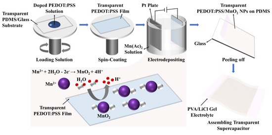 Manufacturing steps of PEDOT:PSS/MnO2 NPs stretchable and transparent supercapacitor.
