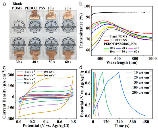 Transparency and electrochemical characteristics of the PEDOT:PSS/MnO2 NP Electrodes. (a) Digital photos and (b) Transmittance spectra (using air as the reference) of blank PDMS, PEDOT:PSS electrode and PEDOT:PSS/MnO2 NP electrodes with various deposition time. (c) CV curves and (d) GCD curves of the PEDOT:PSS/MnO2 NP electrode with deposition time 40 s.