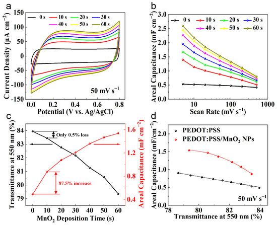 The relationship between the electrochemical performance and transparency of PEDOT:PSS/MnO2 NP electrodes with the deposition time was systematically studied. Figure 6a shows the CV curves of various electrodes at a sweep rate of 50 mV s−1. The CV curve of the PEDOT:PSS electrode presents a nearly square shape, demonstrating a good capacitive response. With the deposition time expands, the area enclosed by the CV curves gradually enhances, suggesting the pseudo-capacitance provided by the deposited MnO2 NPs. Its energy storage mechanism is charge transferred through the Faradaic redox reaction between Mn4+ and Mn3+ in the electrolyte [29,41]: