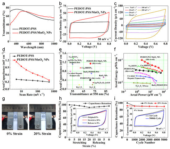 Properties of PEDOT:PSS and PEDOT:PSS/MnO2 NPs transparent and stretchable supercapacitors. (a) Transmittance spectra of these two supercapacitors. (b) CV curves of these supercapacitors with a sweep rate of 50 mV s−1. (c) CV curves of the PEDOT:PSS/MnO2 NP supercapacitor. (d) Comparison of areal capacitance of these supercapacitors at various scan rates. (e) Comparison of areal capacitance and transparency of these two supercapacitors with other transparent supercapacitors [34,35,42,43,44,45,46,47,48]. (f) Ragone plot of these two supercapacitors compared with other transparent symmetric supercapacitors [34,43,44,45,47]. (g) Photos of the PEDOT:PSS/MnO2 NP supercapacitor under different strains. (h) Capacitance retention of the PEDOT:PSS/MnO2 NP supercapacitor during the stretching and releasing process with different strains. The CV curves are shown in the inset. (i) Capacitance maintenance of the PEDOT:PSS/MnO2 NP supercapacitor during 5000 cycles of 20% strain, stretching and releasing. CV curves of the 1st and 5000th cycles are shown in the inset.