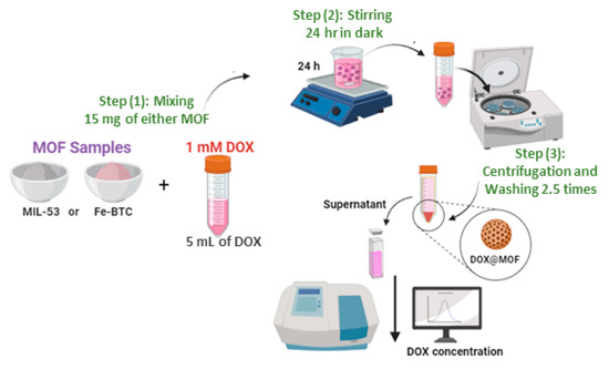 DOX loading experiments were carried out in triplicates. In each run, 15 mg of the MOF sample (Fe-BTC and MIL-54 (Al)) was mixed with 5 mL of 1 mM DOX solution (with deionized water (DI) as the solvent). The mixture was allowed to stir overnight under dark conditions for 24 h. The resulting suspension was centrifuged for 15 min at 6000 rpm. The supernatant was removed, and the absorbance was measured in a UV–Vis spectrophotometer to determine the concentration of the DOX solution. The resultant material was washed twice with PBS to remove any unencapsulated DOX and then dried in an oven at 80 °C for 1 h (Figure 1).