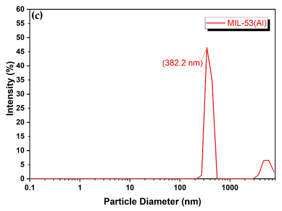 The XRD pattern of the pure MIL-53(Al) is presented in Figure 4a, which follows the distinctive characteristic peaks at 2θ values of 9.28°, 12.42°, 17.8°, 25.14°, 27.08°, as reported in the literature [47,48]. The sharp, well-defined peaks observed in the XRD pattern of MIL-53(Al) are indicative of its high crystallinity compared to the after-DOX-loading and post-release samples. Despite the minor changes in the intensity of the XRD pattern for the after-loading and post-release samples, MIL-53(Al) exhibits excellent structural stability. Further, the observed reduction and weakening in the XRD peak intensities in both the after-loading and post-release samples can be attributed to the successful encapsulation of DOX molecules within the pores of MIL-53(Al) [49].