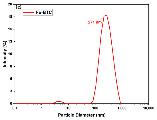 Figure 3a,b represent the FE-SEM images of Fe-BTC samples before and after DOX loading, respectively. Irregular spherical agglomerates were observed, which is commonly attributed to the low degree of crystallinity of pure Fe-BTC [41]. The low crystallinity indicates disorder in the atomic arrangement, leading to non-uniform particle shapes. The morphology was retained post-loading without causing any significant alteration to the external crystal structure, indicating DOX was encapsulated inside the pores and not visible on the external surface [41,42,43,44,45]. Dynamic light scattering was performed to confirm particle size further, as shown in Figure 2c and Figure 3c. Also, narrow size distribution indicates good dispersity [25]. The results confirm that MIL-53 and Fe-BTC have particle sizes of ~477 nm (with around 83% of the particles having around 382.2 nm particle diameter) and 270 nm, respectively, which are desirable for our application [30,46].