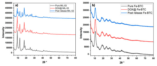XRD patterns of (a) MIL-53, DOX@ MIL-53, and DOX@MIL-53 post MW release; (b) Fe-BTC, DOX@Fe-BTC, and DOX@Fe-BTC post MW release.