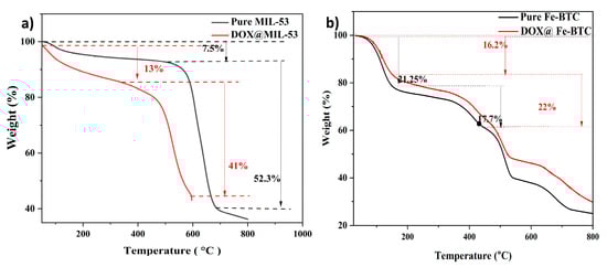 The thermal stability of Fe-BTC and MIL-53 (Al) was investigated over the 30–800 °C temperature range by thermal gravimetric analysis (TGA). Figure 5a depicts the thermal stability of MIL-53 with two main weight-loss stages. The first weight loss of 7.5 wt.% from 50 to 450 °C corresponds to the desorption of solvents and free water molecules entrapped within the MOF pores. Beyond 450 °C, a substantial extra weight loss (~52 wt.%) was observed, mainly associated with the framework, particularly ligand decomposition [53,54]. The elevated decomposition temperature observed for MIL-53(Al) is consistent with the literature and is well-suited for drug-delivery applications [40]. A similar trend was observed for the DOX@MIL-53(Al) samples, proving that the MOF’s stability was maintained following drug loading.