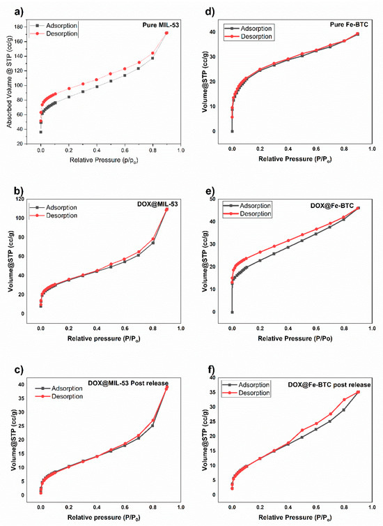 The N2 adsorption/desorption isotherms for (a) MIL-53, (b) DOX@MIL-53, (c) DOX@MIL-53 post release, (d) Fe-BTC, (e) DOX@Fe-BTC, and (f) DOX@Fe-BTC post release.