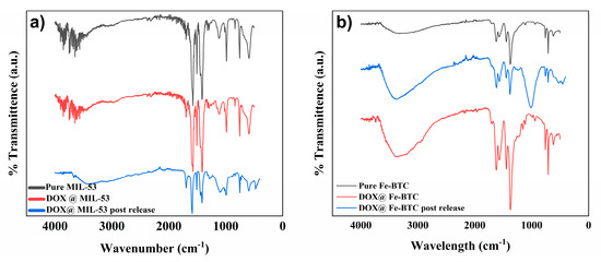The FTIR analysis presented in Figure 7a shows the absorption peaks of MIL-53(Al) before and after DOX loading. The measured IR spectrum of MIL-53(Al) supports previously reported results in the literature [48,58]. The absorption peaks at 1417 cm−1 depict C-O-H stretching, whereas the peaks at 1697 and 1576 cm−1 reveal the presence of COO– asymmetric bond stretching vibration. The absorption peak at 3526 cm−1 relates to the ·OH stretching vibration [48]. The FTIR spectra of the DOX@ MIL-53(Al) showed peaks that were similar to the pristine MIL-53(Al) but were slightly higher and wider, indicating the encapsulation of the drug molecules in the MOF [30].