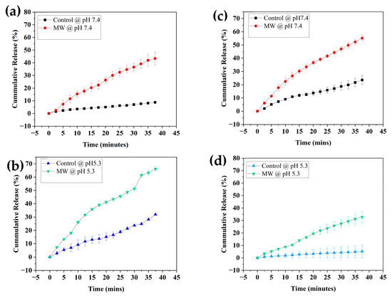 Doxorubicin-release profiles from (a) MIL-53 at pH 7.4 with and without MW irradiation; (b) MIL-53 at pH 5.3 with and without MW irradiation; (c) Fe-BTC at pH 7.4 with and without MW irradiation; (d) Fe-BTC at pH 5.3 with and without MW irradiation.