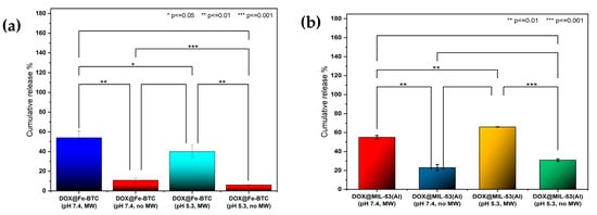 Figure 9a–d demonstrates the drug-release profiles for DOX from MIL-53(Al) and Fe-BTC, respectively. Exposure to MW irradiation at a frequency of 2450 MHz and a power of 200 W after 20 cycles (50 min) improved the drug-release efficiency by 32% at pH 7.4 for MIL-53(Al) and by 34% at pH 5.3 (Figure 9a,b). On the other hand, at a pH of 7.4, the improvement was more pronounced in the case of Fe-BTC than in the case of MIL-53(Al). The release % after 20 cycles was observed to be around 40% at pH 5.3 because of MW exposure, in contrast to only 6% without MW. While at pH 7.4, the release % reached up to 54% with MW and 11.4% without (Figure 9c,d). The p-value, determined using the two-tailed T-test, comparing experiments at pHs of 5.3 and 7.4 was calculated to be less than 0.05. Figure 10a,b represent the p-value summary for the maximum release after 40 min of MW irradiation for both MIL-53 and Fe-BTC MOFs, respectively. The preliminary results show clear enhancement in the MW release, regardless of the pH. The drug was not released even at lower pH values in the absence of an external MW stimulus.