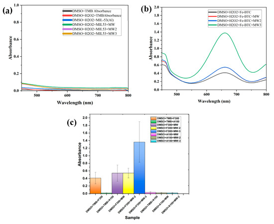 The absorption spectra of DMSO in MIL-53(Al) and Fe-BTC are shown in Figure 11a,b, respectively. The DMSO and TMB mixture exhibited no peak at 652 nm, indicating no ·OH generation. This changed with the addition of H2O2 and Fe-BTC. Unlike MIL-53(Al), Fe-BTC catalyzed H2O2 and produced ·OH under 20s of MW irradiation, as shown in Figure 11a. The color change is associated with the formation of oxidized 3,3′,5,5′-tetramethylbenzidine (TMB), a product of the reaction between ·OH and TMB [52]. On the other hand, no color change was observed for MIL-53(Al). The absence of net ·OH radicals generated in the case of MIL-53(Al) could be attributed to the benzene dicarboxylic acid (bdc) ligand present in the MIL-53 framework. Bdc is identified as an ·OH scavenger. Previous studies have reported that bdc reacts with ·OH radicals to form hydroxy cyclohexadienyl. Bdc or hydroxylated bdc may be formed as end products by dismutation in this pathway; hence, the MOF framework may be conserved during the ·OH scavenging process by bdc. MIL-53(Al) is also highly stable and hydrolysis resistant in neutral and acidic solutions; this could be attributed to the strong chemical bonding between aluminum atoms in the secondary building units and oxygen atoms. Moreover, the aromatic walls in MIL-53(Al) render the structure hydrophobic and prevent the dissolution of the framework. All of these properties combined could be the reason no ROS generation was detected for MIL-53(Al) [65,66].