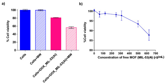 Cytotoxicity assays on Jurkat cell lines. (a) Impact of microwave treatment on doxorubicin release from MIL-53(Al) metal-organic frameworks (MOFs) and cell viability reduction in Jurkat cell lines. The test solutions (Cells + DOX_MIL-53(Al) + MW) were subjected to microwave treatment, leading to a statistically significant reduction in cell viability with p < 0.0001 compared to the untreated control data. One-way ANOVA was used for statistical estimation. Data in the figure represent means ± SD of three independent experiments. (b) Cytotoxicity studies with free MIL-53(Al). The graph shows the variation in viability of cells (Jurkat) with DOX-unloaded MIL-53(Al).