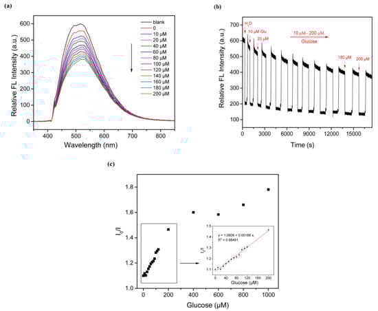 (a) This section presents the fluorescence spectra of the optical fiber sensor when exposed to glucose solutions of varying concentrations, ranging from 10 to 200 μM. (b) The diagram in this section illustrates the time sequence for detecting glucose using the optical fiber sensor. (c) The calibration curve provided here showcases the relationship between the concentration of glucose and the response of the optical fiber sensor, facilitating the determination of glucose levels. Reprinted with permission from Ref. [62], Elsevier, https://doi.org/10.1016/j.bios.2019.111760.