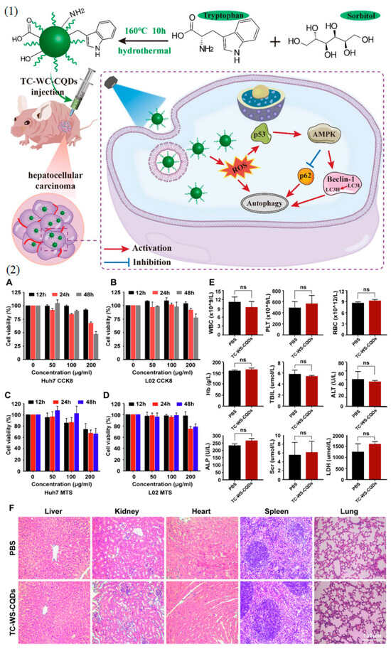 (1) Graphical representations delineating the synthesis procedure of Tryptophan-sorbitol-based carbon quantum dots (TC-WS-CQDs) and their theranostic mechanism against hepatocellular carcinoma are provided. (2) The biocompatibility of TC-WS-CQDs is evaluated through various assays. (A–D): Cell viability assays conducted on Huh7 cells and L02 cells using the CCK8 assay (A,B) and the MTS assay (C,D). Cells were seeded into 96-well plates at a density of 8 × 103 cells/well. (E,F): Toxicity assessment of TC-WS-CQDs in BALB/nu mice (n = 5). Mice received intravenous injections of TC-WS-CQDs or PBS (300 μL) every 2 days. Blood and organs were collected on day 14 for analysis. (E): Complete blood count test and serum biochemistry results, including white blood cells (WBC), platelets (PLT), red blood cells (RBC), hemoglobin (Hb), total bilirubin (TBIL), alanine aminotransferase (ALT), alkaline phosphatase (ALP), serum creatinine (Scr), and lactate dehydrogenase (LDH). Data represent mean ± SD (n = 3 in (A–D), n = 5 in (E)). Statistical significance analysis was performed using the Mann–Whitney test or unpaired t test where appropriate, with “ns” indicating not significant. (F): Histological evaluation of major organs from the mice. Reprinted with permission from Ref. [91] 2022, Springer-Nature, https://doi.org/10.1186/s12951-022-01275-2.