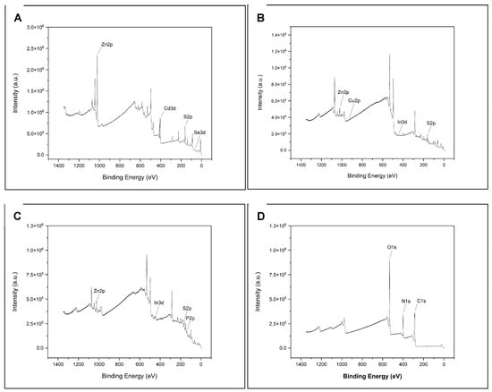 XPS spectra for each quantum dot. The graphs show the binding energy and peak intensity for each component of the QD. (A–D) represent a specific QD as labeled.