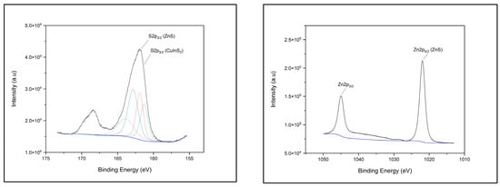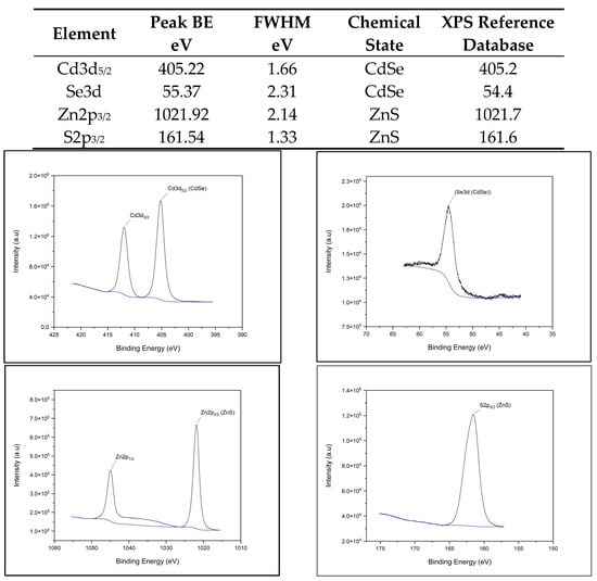 X-ray photoelectron spectroscopy (XPS) was used to verify the chemical composition of each of the QDs used in this study. Sample preparation for XPS was the same for all samples, where 10 µL was pipetted onto clean silicon (Si) substrates and allowed to dry in air in a desiccant dry box. XPS measurements were carried out using a Thermo Scientific Nexsa System equipped with a microfocused, monochromated, Al Kα (1486.6 eV) X-ray radiation source. All spectra were collected using a 400 µm spot size in a ~8 × 108 mbar vacuum environment. The survey scans were collected at a pass energy of 200 eV and binding energy (BE) steps of 0.10 eV. All data analysis was conducted using Thermo Scientific AVANTAGE v5 software and compared to several XPS databases (https://srdata.nist.gov/xps/ (accessed on 2 June 2024), https://xpsdatabase.com/ (accessed on 2 June 2024), https://www.xpsfitting.com/ (accessed on 2 June 2024). All peaks were charge-compensated to the adventitious C peak at 284.5 eV.