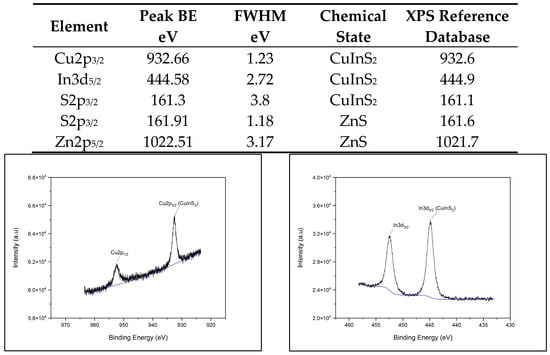 CuInS2/ZnS QD high-resolution XPS spectra with corresponding peak table.