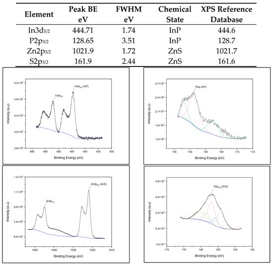 InP/ZnS QD high-resolution XPS spectra with corresponding peak table.