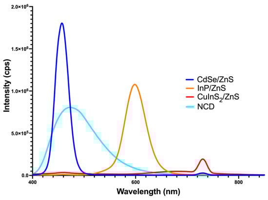 The mean fluorescent spectra for each quantum dot with lines corresponding to the color of fluorescence (n = 3). The concentrations used for reading were 50 nM for CdSe/ZnS and 100 nM for InP/ZnS, CuInS2/ZnS, and NCDs.