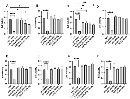 The effect of CdSe/ZnS, InP/ZnS, CuInS2/ZnS, and NCDs on the cell viability of HepG2 and THLE-2 liver cells compared to a non-treated control (NTC) and positive control (20% DMSO). Cell viability is determined by the average absorbance values in the delta wavelength range (450–630 nm) where a lower value correlates to less cell viability. (A–D) The top row of graphs shows the effect on cell viability in THLE-2 cells with the following order: CdSe/ZnS, InP/ZnS, CuInS2/ZnS, and NCDs (carbon dots). (E–H) The bottom row shows the same except in HepG2 cells. Statistical analysis is indicated by * p = 0.05, ** p = 0.01, **** p = 0.0001. The mean values (n = 3) include ±SEM.
