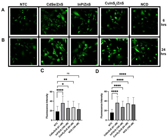 ROS images of THLE-2 cells treated with QDs. All images are representative images of a cell sample size of 60 cells repeated in triplicate (n = 3). The first row of images (A) is after 6 h of incubation in QDs, and the second row (B) is after 24 h of incubation. The figures below (C,D) represent the fluorescent intensity with ±SEM for each image quantified using ImageJ software. The figure on the bottom left (C) corresponds to the 6 h treatment, and the bottom right (D) to the 24 h treatment. Statistical analysis is indicated by * p = 0.05, ** p = 0.01, **** p = 0.0001.