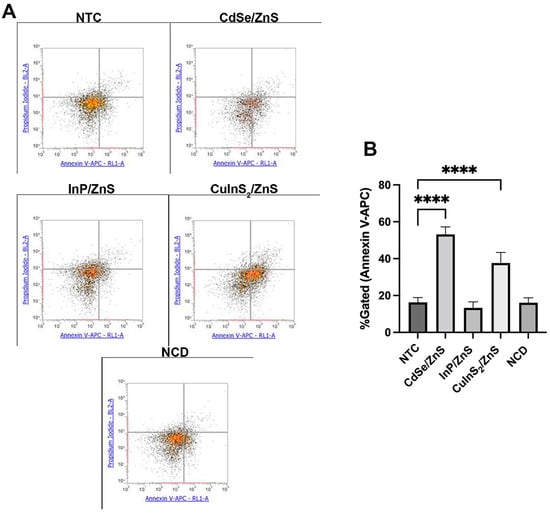 When investigating apoptosis after a 24 h QD treatment, we noticed differences in activation of the early stages of apoptosis. This is made evident by a clear shift in quadrants observed in the flow cytometry plots (Figure 9A). Namely, CdSe/ZnS induced an average of 52% cells bound with Annexin V-APC, and CuInS2/ZnS an average of 38% (Figure 9B). When compared to the NTC, we observed InP/ZnS and NCDs to have no discernible changes as around 16% of the cells demonstrated the marker for early apoptosis (Figure 9B).