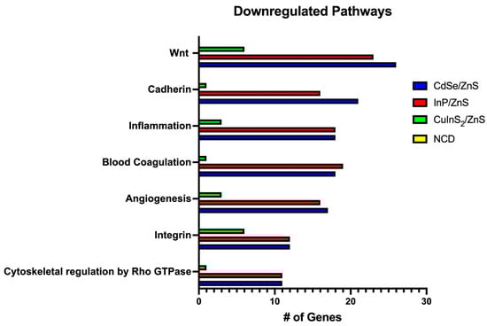 The pathways with the most genes downregulated according to Panther 18.0 functional classification analysis. Each QD is color-coded, and only differentially expressed genes were considered (fold change < −1.5, p-value < 0.05).