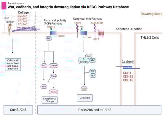 A common trend we found in metallic-based QD treatments was the ability to downregulate genes related to cell structure and adhesion. Wnt signaling is a diverse pathway with implications in cell proliferation, cell polarity, differentiation, and cell motility []. Both the canonical and noncanonical (PCP) wnt pathways demonstrated significant downregulation (Figure 11). The downstream effects of this dysregulation could lead to cytoskeletal defects, particularly with actin polymerization []. In yeast models, research has been conducted demonstrating the direct inhibition of actin polymerization by CdSe/ZnS quantum dots []. Our study indicates an additional indirect mechanism that could be affecting actin polymerization, notably in a human cell line. Cadherins play a crucial role in establishing adherens junctions that keep cells tightly together. Loss of cell-to-cell adhesion could lead to abnormal tissue morphogenesis []. In addition, collagen genes related to integrin and the extracellular matrix were significantly downregulated, pointing to more changes in structurally related genes. The changes to integrin pathway expression are the primary downregulated adhesion pathway in CuInS2/ZnS-treated THLE-2 cells favoring this over cadherin and wnt signaling (Figure 11). The minimal downregulation caused by NCD treatment resulted in no clear pattern of genetic alteration.