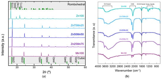 A new family of PBAs with different Zn and Mn contents, Mn1−xZnxHCF (x = 0, 0.25, 0.5, 0.75, and 1), has been synthesised and characterised. PBAs can crystallise in different crystal structures depending on factors such as the synthesis process, the type of transition metal, or the degree of zinc insertion. Among the most common structures in the literature cubic, orthorhombic, rhombohedral, and monoclinic are found [30,31,32]. Figure 2a shows the diffractograms obtained for the synthesised samples together with the theoretical positions of the main diffraction peaks for the cubic (space group: Fm-3m) and rhombohedral (space group: R-3c) structures. Using the coprecipitation synthesis route, in the case of the manganese sample (Mn100), the diffraction peaks are well-defined and sharp and the diffraction pattern matches with the cubic structure, in good agreement with the structure reported by other authors in the literature [33,34,35,36,37]. The diffraction pattern of the Zn100 sample fits a rhombohedral/hexagonal structure (R-3c), as has been described in the bibliography [35,38,39], and no impurities are observable. The samples doped with Zn in the Mn site present a diffraction pattern corresponding to a cubic structure, although as the Zn content increases, the presence of a small peak around 16.2° (2θ), accompanied by other weak signals at higher angles can be detected. This new peak appears at an angle very close to the 100% intensity peak of the rhombohedral phase corresponding to the Zn100 sample. The presence of this peak can be explained based on the presence of a small concentration of a secondary phase with a rhombohedral structure together with a preferential phase with a cubic structure.