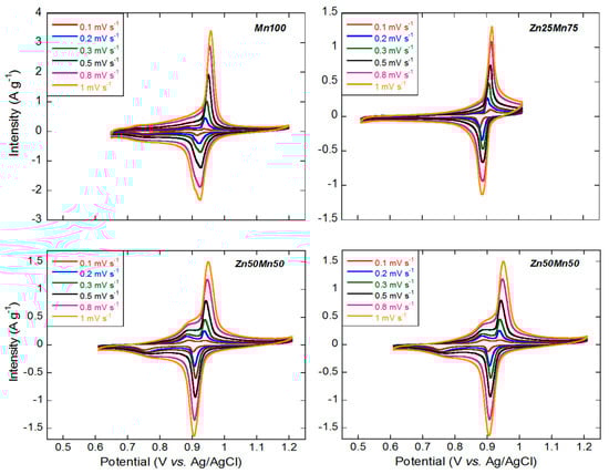 Before integrating the prepared materials into AZiBs, the reaction kinetics of each compound were studied by means of cyclic voltammetry (CV) measurements at different scan rates from 0.1 to 1.0 mV s−1. It should be noted that in the case of Zn100 sample, the CV obtained does not show any peak (Figure S2) and therefore its electrochemical activity is practically zero, in good agreement with results reported by other authors [54,55]. Also, as can be seen in Figure 4, in the case samples with high amounts of Mn (Mn100 and Zn25Mn75), CV curves show two major peaks, which maintain the shape during the experiment at different rates. The peaks that appear at 0.95/0.98 V vs. Ag/AgCl during oxidation and at ca. 0.90 V during reduction correspond to the Mn3+/Mn2+ redox pair and, as expected, as the scan rate increases the intensity of the peak increases, perceiving a slight shift towards higher potentials in the oxidation branch and towards lower values in the reduction branch. By increasing the zinc content (and therefore decreasing the amount of Mn in the sample), the appearance of another signal at 0.9/0.87 V vs. Ag/AgCl (oxidation) and ca. 0.75 V (reduction) is distinguished for the Zn50Mn50 phase that is assigned to the Fe3+/Fe2+ redox pair [39,56]. The intensity ratio of the redox pairs corresponding to Mn and Fe is further balanced when examining the sample Zn75Mn25. Taking into account the maximum intensities reached by the different samples, the superiority in terms of electrochemical activity of the Mn100 sample is clear.